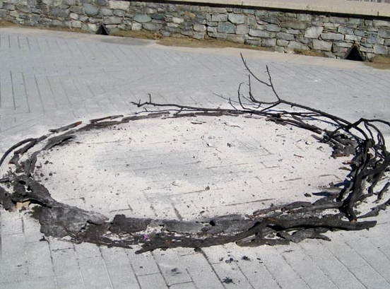 Le cercle de cendres, d’écorces et de branches brûlées est le symbole du cycle continu de la vie, sans début ni fin. Les écorces et les branches me rappellent ce qu’ils étaient… Les cendres, la matière transformée réduite à l’état de poussière est l’espoir d’une nouvelle vie. Elles ont fertilisé la terre, créant un paysage curieux, où s’unissent la vie et la mort; les couleurs vives des fleurs en contraste aux arbres brûlés.